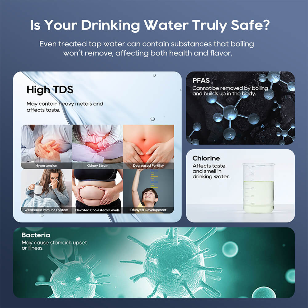Wyposażony w precyzyjną membranę RO 0,0001 μm i zintegrowaną sterylizację UV, JIMMY R9 PRO zapewnia profesjonalne oczyszczanie wody z ponad 99% usuwaniem zanieczyszczeń. Skutecznie filtruje ołów, chlor, azotany i PFAS, jednocześnie znacznie redukując metale ciężkie, bakterie i wirusy. Rezultatem jest niezmiennie czysta, bezpieczna i smaczna woda.