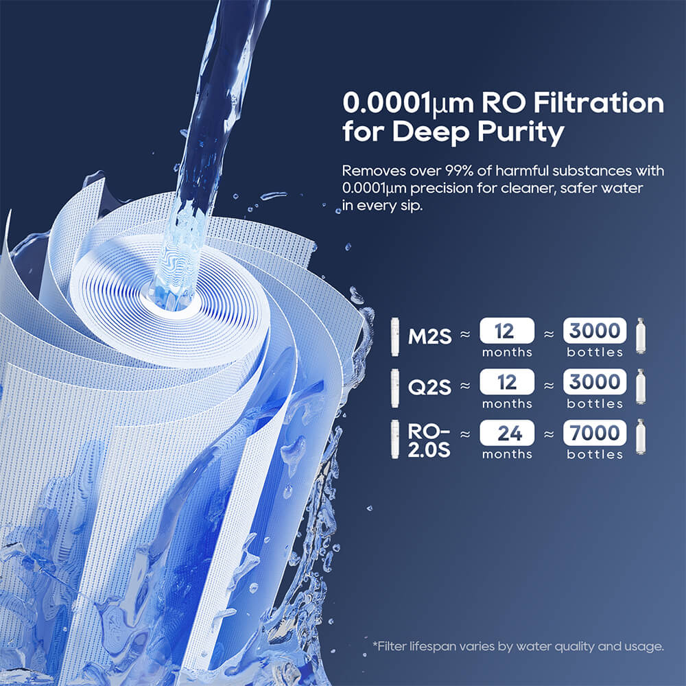 JIMMY R9 Pro został zaprojektowany z filtrami wstępnymi M2S i Q2S o przedłużonej żywotności, z których każdy może działać do 12 miesięcy lub 3000 butelek, w połączeniu z membraną RO2.0S o wysokiej wydajności, działającą do 24 miesięcy lub 7000 butelek. Ten trwały system filtracji zmniejsza częstotliwość wymiany, obniża koszty konserwacji i zmniejsza ilość odpadów z tworzyw sztucznych.