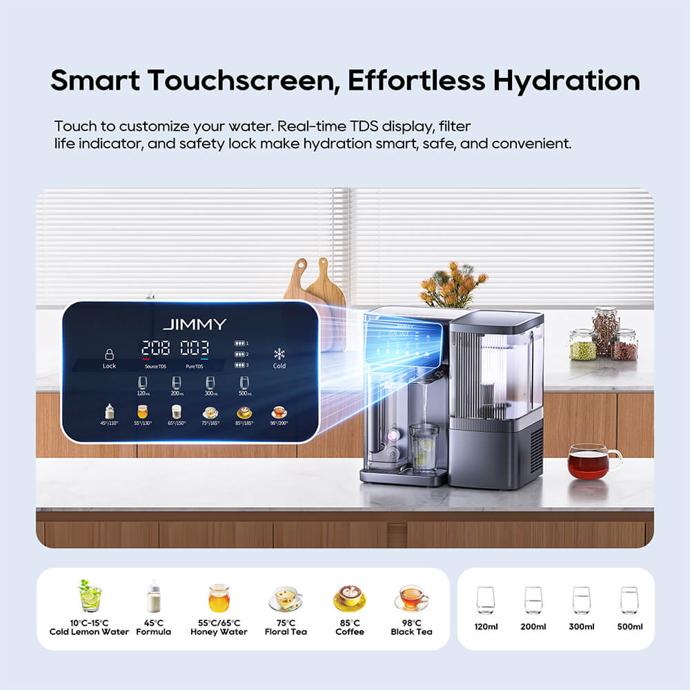 JIMMY R9 PRO zapewnia idealnie podgrzaną wodę w zaledwie 3 sekundy, oferując sześć ustawień temperatury (45 ℃ / 55 ℃ / 65 ℃ / 75 ℃ / 85 ℃ / 98 ℃) oraz orzeźwiające zimno (10-15 ℃) i opcje otoczenia. Można go używać do mieszanek dla niemowląt, herbaty, kawy i codziennego nawadniania, a także precyzyjnie kontrolować objętość (120 ml, 200 ml, 300 ml lub 500 ml).